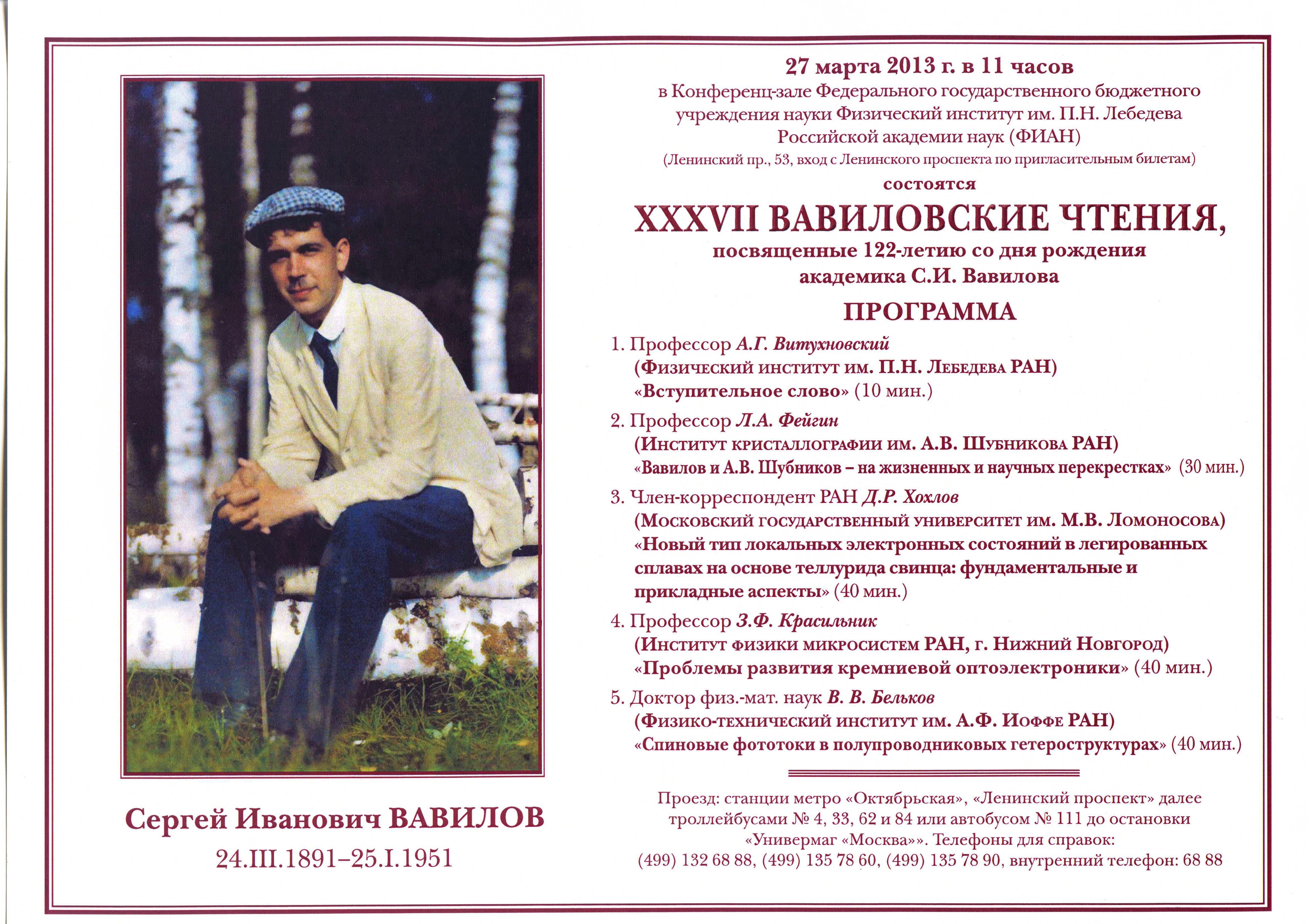 XXXVII ВАВИЛОВСКИЕ ЧТЕНИЯ, посвященные 122-летию со дня рождения академика С.И. Вавилова