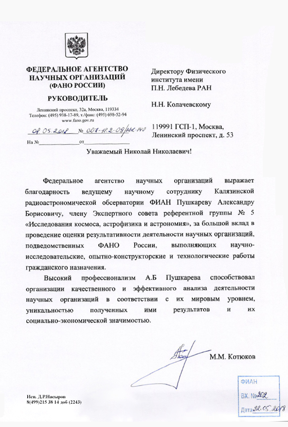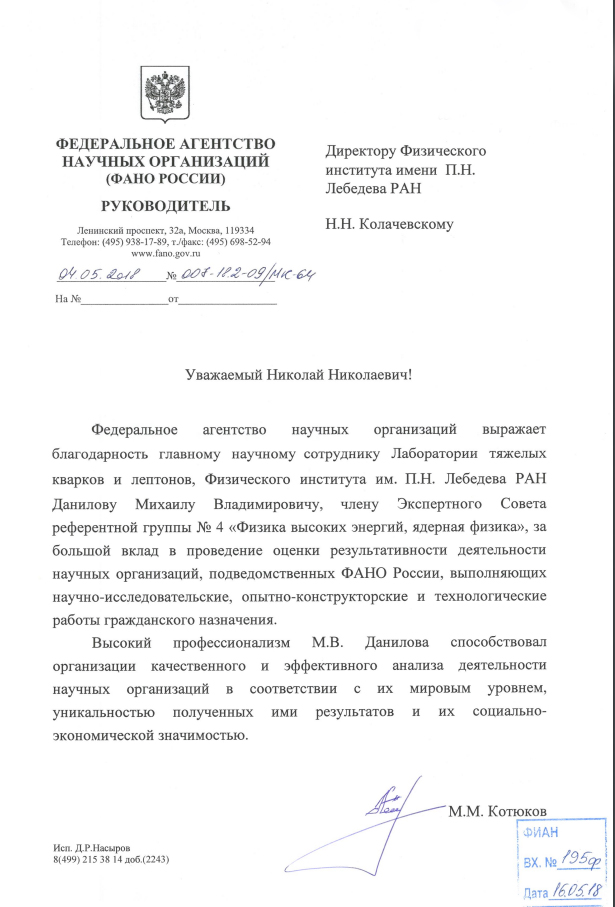 Федеральное агентство научных организаций выражает благодарность главному научному сотруднику ФИАН Михаилу Владимировичу Данилову, заведующему лабораторией ФИАН Пудалову Владимиру Моисеевичу, ведущему научному сотруднику ФИАН Пушкареву Александру Борисовичу, за большой вклад в проведение оценки результативности деятельности научных организаций, подведомственных ФАНО России, выполняющих научно- исследовательские, опытно-конструкторские и технологические работы гражданского назначения